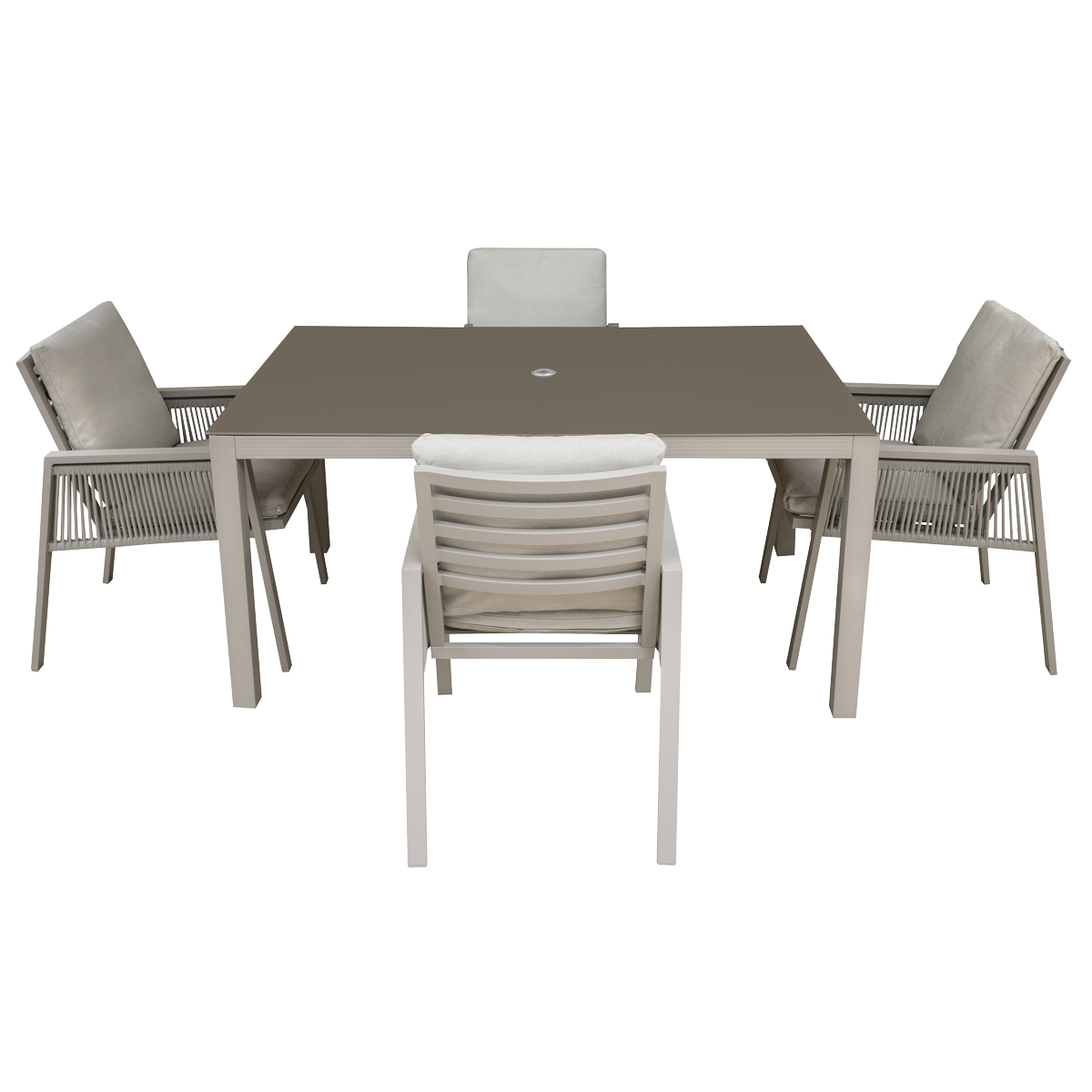 A sophisticated 5-piece outdoor dining ensemble crafted for premium garden entertaining. Combining a rust-proof aluminium frame with contemporary Textilene® rope detailing, this set features four high-back armchairs and a spacious tempered glass dining table, offering a perfect fusion of modern industrial style and durable comfort.